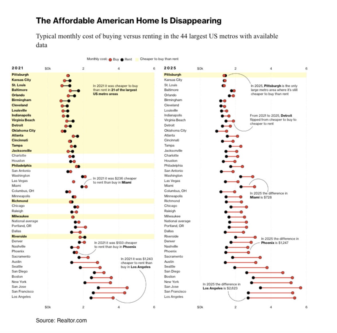 However, as of June, the cost of owning was higher in 49 of the 50 largest U.S. metropolitan areas, according to Bloomberg. Pittsburgh is the last major city where owning is cheaper than renting: