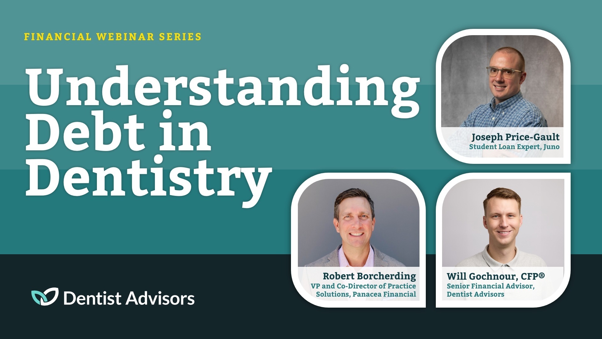In this webinar, Will Gochnour, CFP®, of Dentist Advisors will share practical frameworks to help dentists think about debt more strategically and distinguish between helpful and harmful debt. He will be joined by student loan professional Joseph Price-Gault from Juno and Rob Borcherding from Panacea Financial, where they’ll tackle common questions and help you gain insight into how to navigate your own debt and loan options.